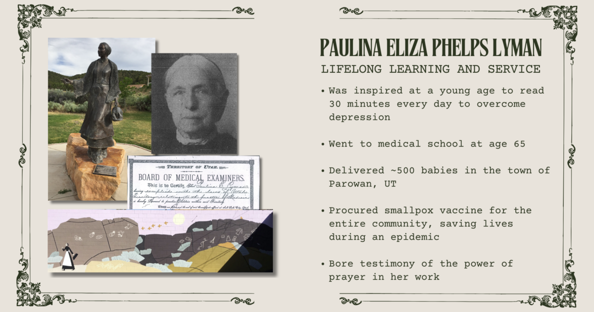 Paulina didn’t formalize her medical training until she was in her 60s, receiving her official obstetrics license after completing a course directed by Dr. Ellis Shipp, Utah’s first certified female physician. Paulina was truly an example of lifelong learning and service. Her example motivates me to continue my personal educational pursuits and inspires me to seek to do good in my own community.